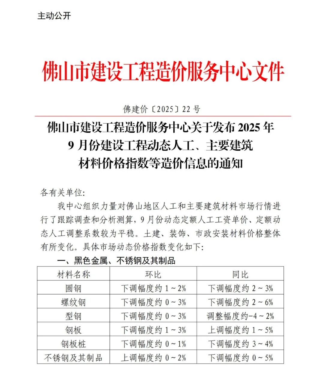 佛山市建设工程造价服务中心关于发布2025年9月份建设工程动态人工、主要建筑材料价格指数等造价信息的通知.pdf