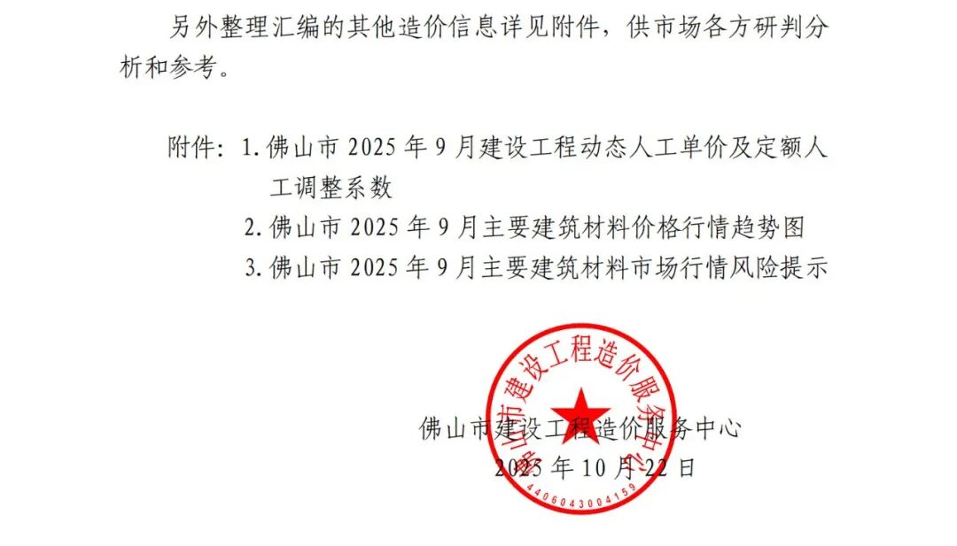 附件:1.佛山市2025年9月建设工程动态人工单价及定额人工调整系数、2.佛山市2025年9月主要建筑材料价格行情趋势图、3.佛山市2025年9月主要建筑材料市场行情风险提示.pdf