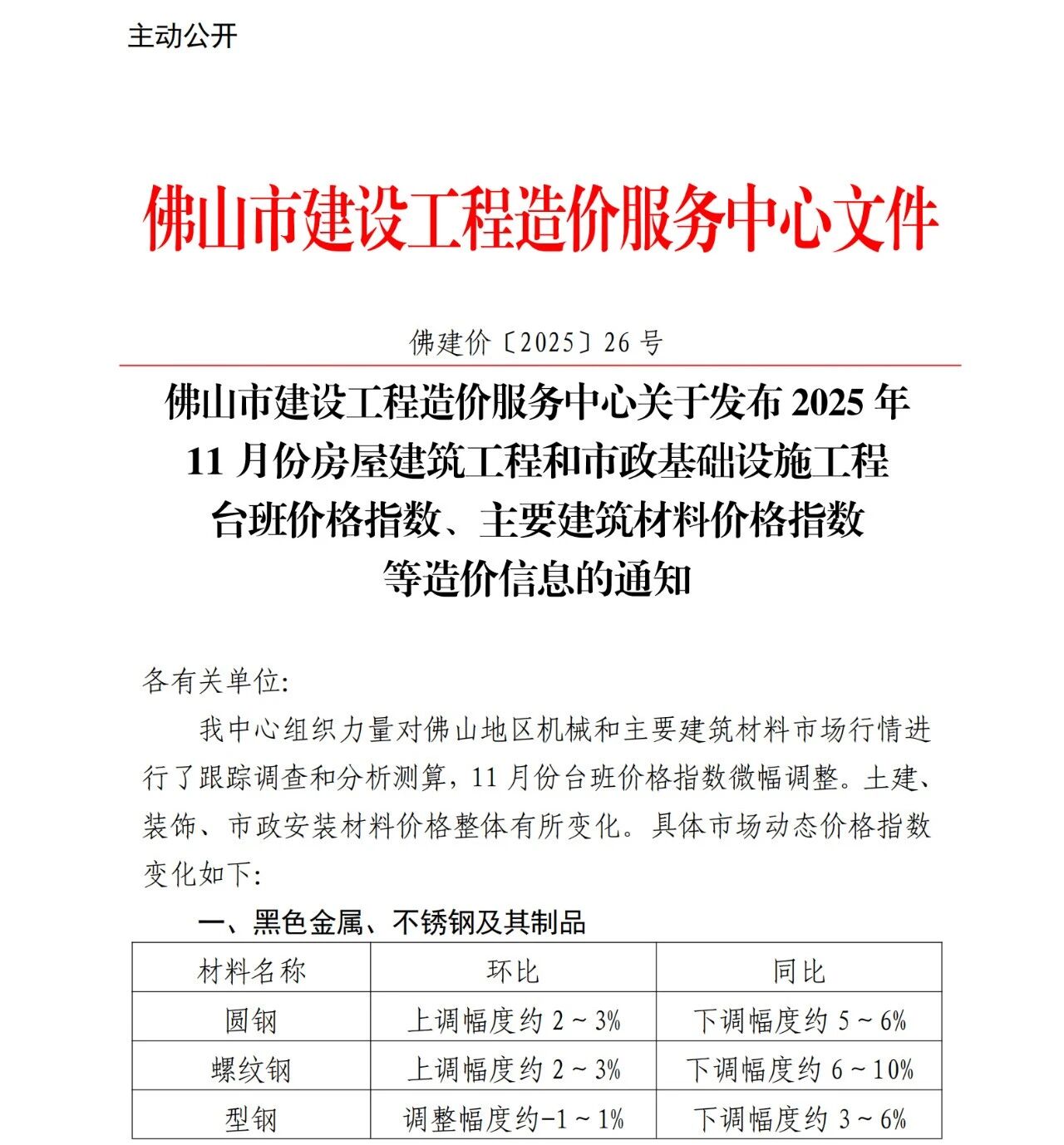 佛山市建设工程造价服务中心关于发布2025年11月份房屋建筑工程和市政基础设施工程台班价格指数、主要建筑材料价格指数等造价信息的通知.pdf