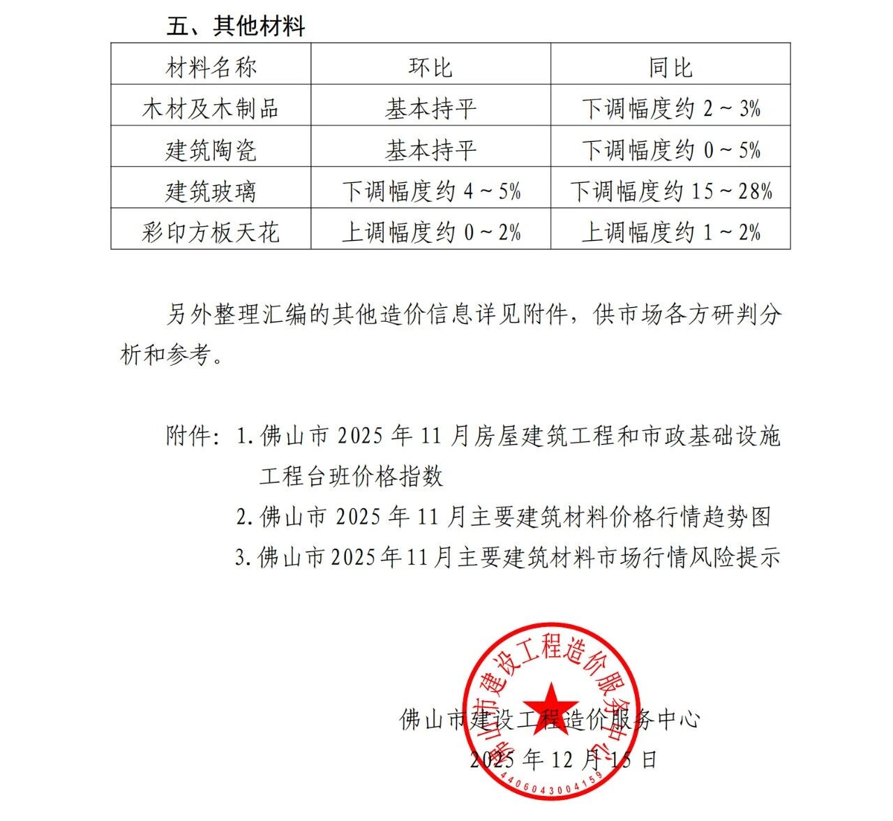 附件:1.佛山市2025年11月房屋建筑工程和市政基础设施工程台班价格指数、2.佛山市2025年11月主要建筑材料价格行情趋势图、3.佛山市2025年11月主要建筑材料市场行情风险提示.pdf