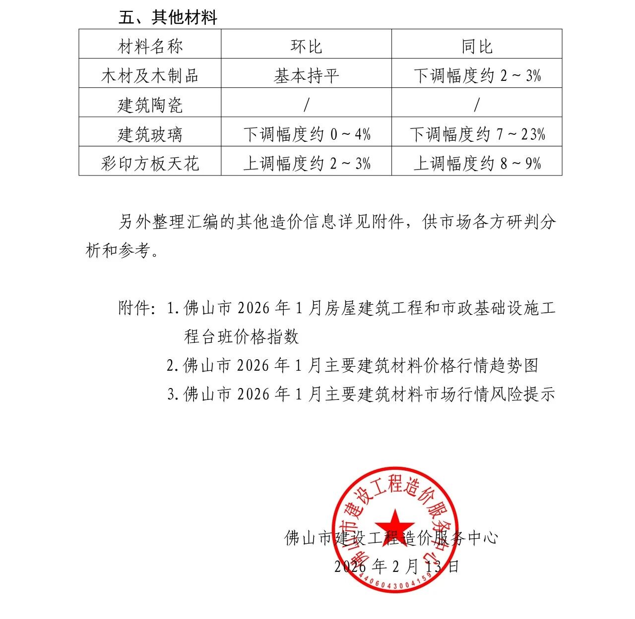 附件:1.佛山市2026年1月房屋建筑工程和市政基础设施工程台班价格指数、2.佛山市2026年1月主要建筑材料价格行情趋势图、3.佛山市2026年1月主要建筑材料市场行情风险提示.pdf